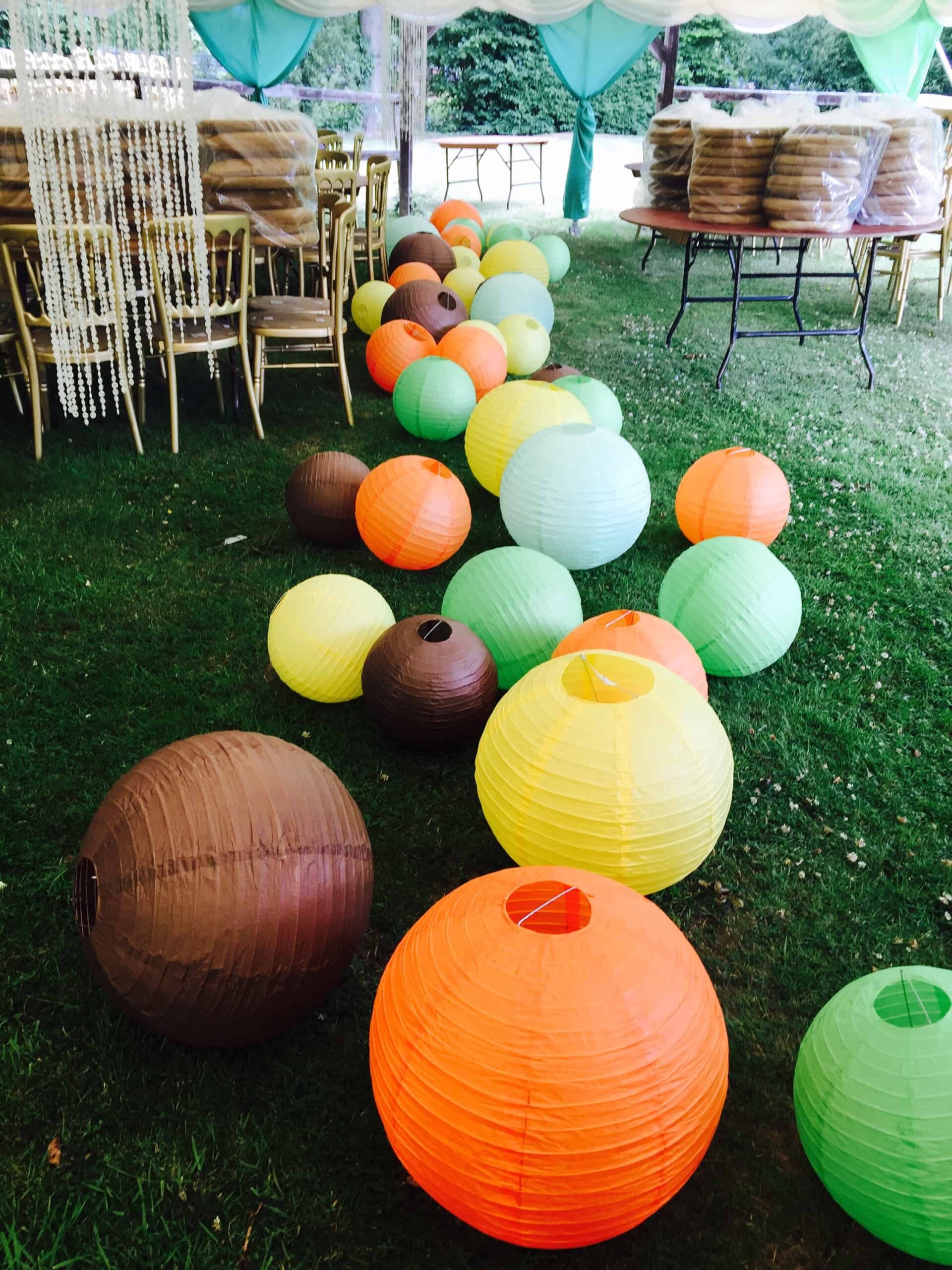 I decided to use different coloured paper lanterns in a range of sizes to decorate the ceiling of the marquee. This didn’t take us too long and I absolutely LOVED the effect it created. You can purchase these lanterns from here. We also draped vines over the lanterns to add a foliage effect. The artificial vines can be purchased from here.