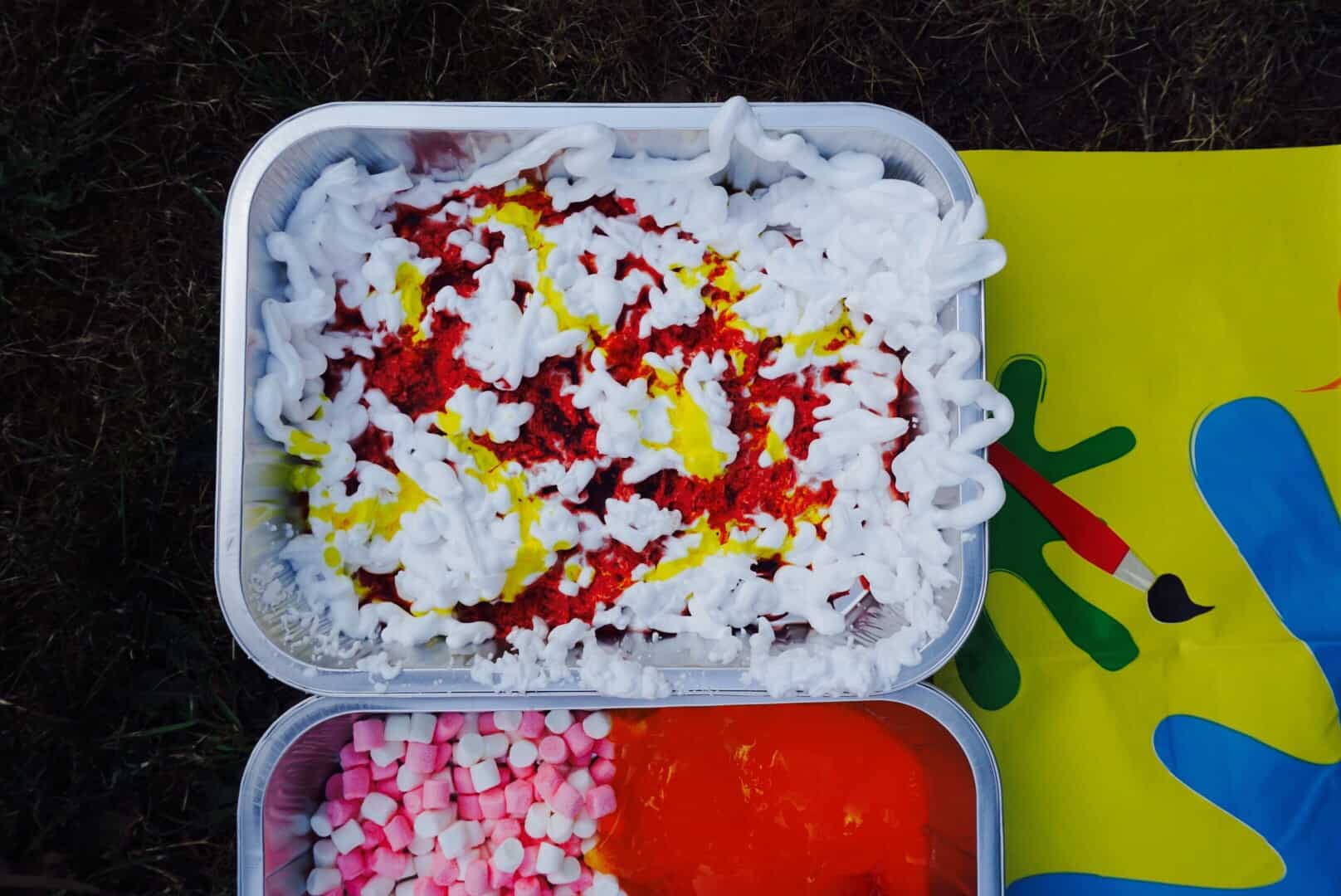 Shaving foam and mixed food colouring – not edible but we watched over him to ensure he didn’t eat it!